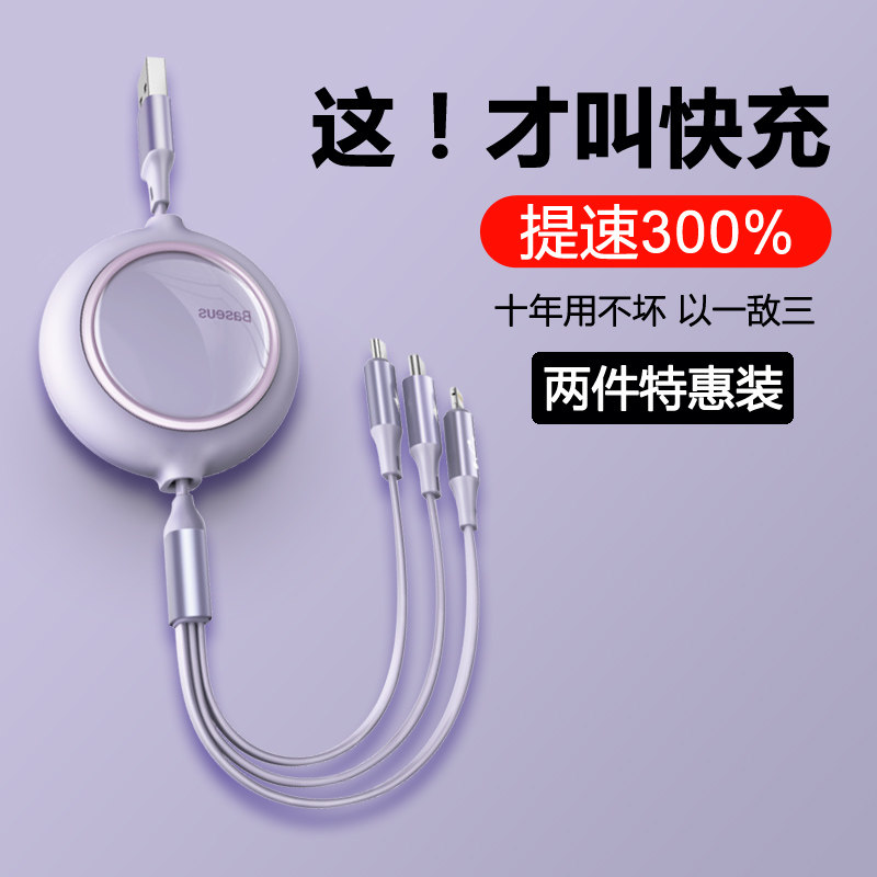 倍思数据线三合一快充三头适用于华为苹果手机充电线typec安卓二合一拖二通用车载多功能转换车用伸缩一拖三热门设计联盟服务商